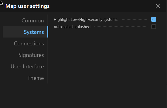 - In the Systems section, Enable Auto-Select splashed unless you want only a specific character to be followed on the map and optionally the Highlight Low/High-security systems